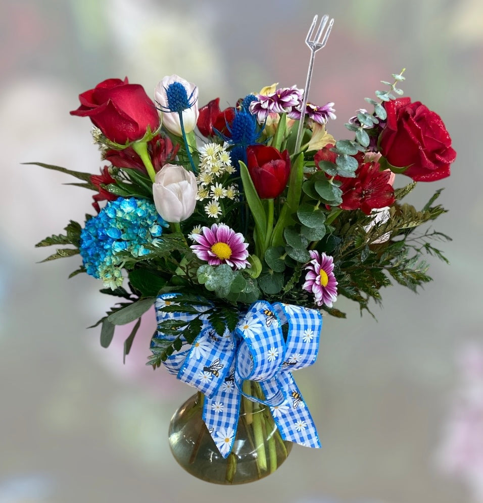 Bring bold color and energy to any space with Electric Rodeo, a vibrant arrangement featuring red, blue, purple, and green blooms. Hand-arranged with care, this lively bouquet is perfect for celebrations, brightening someone’s day, or making a statement wherever it goes.