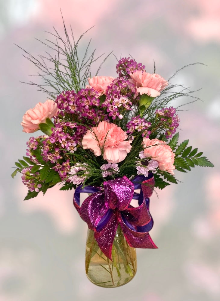 Celebrate life’s joyful moments with Glitter & Grace, a cheerful arrangement featuring pink and purple blooms accented with a fun, purple glittery bow. Hand-arranged with love, this vibrant bouquet is perfect for birthdays, congratulations, or simply to bring a smile to someone you care about.