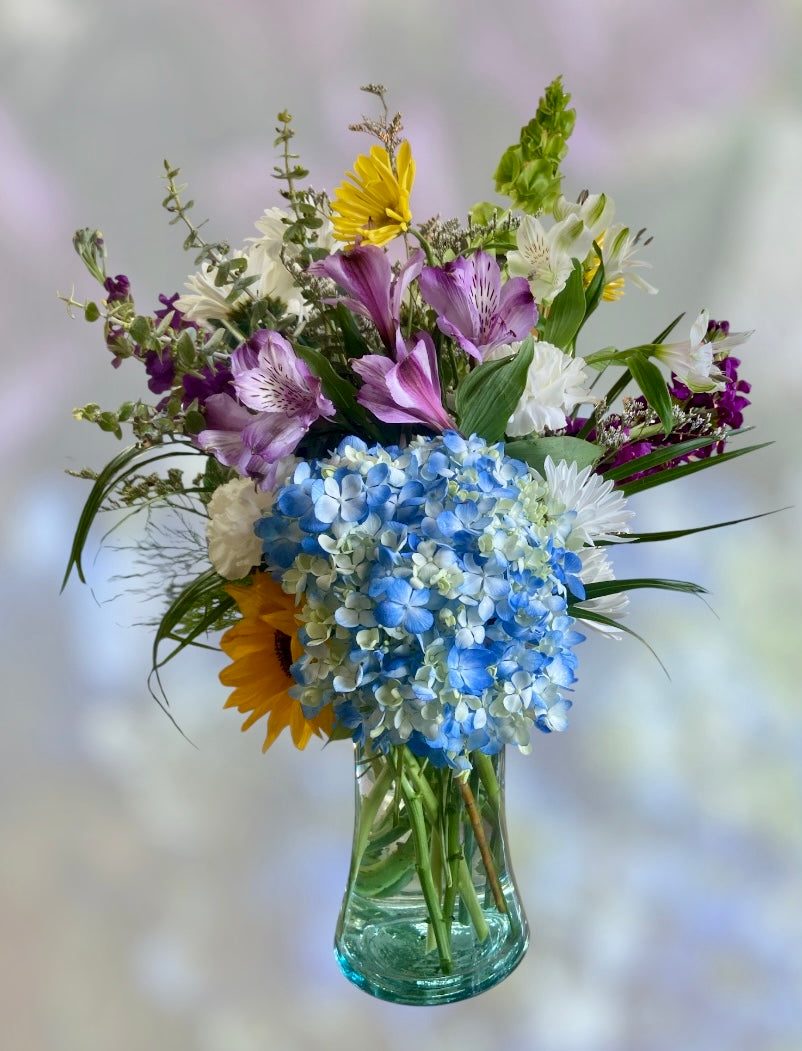 Bright as a sunny day and soft as a summer breeze, this bouquet blends bold blue hydrangeas, cheerful sunflowers, delicate purple Alstroemeria, and classic white carnations. Hand-arranged with care, it’s a stunning mix of color and texture — perfect for celebrations, thank-yous, or just because.